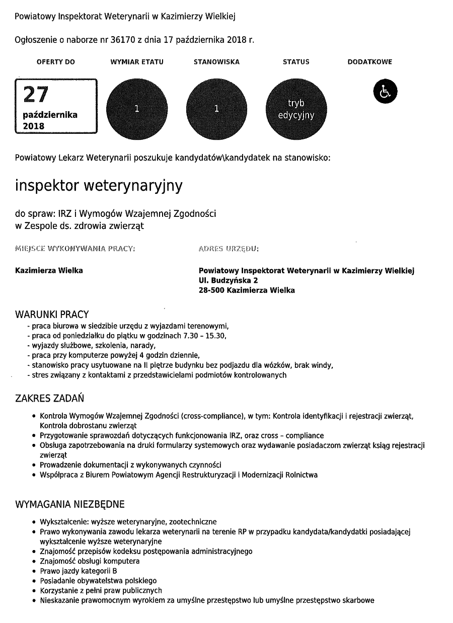 Powiatowy Lekarz Weterynarii poszukuje kandydatów/kandydatek na stanowisko: inspektor weterynaryjny do spraw: IRZ i Wymogów Wzajemnej Zgodności w Zespole ds. zdrowia zwierząt.